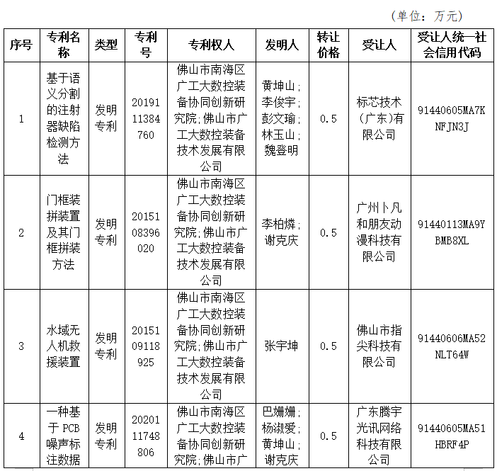 根据《中华人民共和国科学技术进步法》、《中华人民共和国促进科技成果转化法》、《中华人民共和国专利法》、《佛山市广工大数控装备技术发展有限公司科技成果转化管理办法》等相关规定,我司于2025年7月15日对以下11项专利所有权进行首次转让公示(不含受让方信息),现针对受让方信息进行再次公示,具体信息如下: